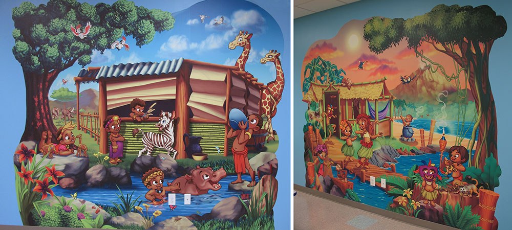 Another variation of full wall murals are contour-cut murals; this is where the mural does not fully extend to the ceiling and/or edge of the wall. Instead, it is trimmed along the outline of an art element such as a cloud, tree, or building. This can be effective for cost-cutting or as a design aesthetic.